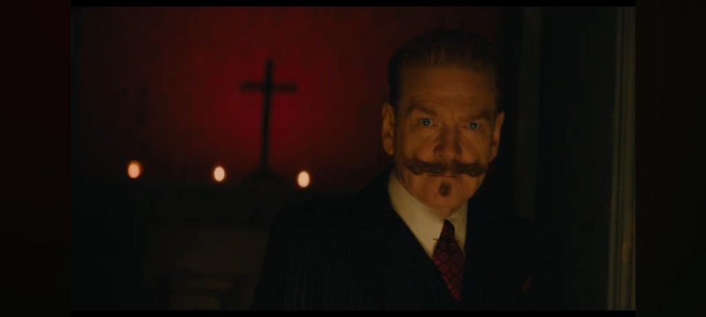 There are a lot of spooky moments, like the initial Halloween party at the creepy house features a chilling shadow puppet show of the dark, plague history of the location where young patients were left abandoned by the doctors and nurses. There’s a bit when Poirot goes bobbing for apples which immediately turns terribly wrong. The reveal of exactly how Joyce died is very gothic. Poirot sees visions of the victim that doesn’t conform to Poirot’s logical views. As in every Poirot film, he finds himself at the climax explaining what happened and some of the dark reveals of how the victim died are twisted.