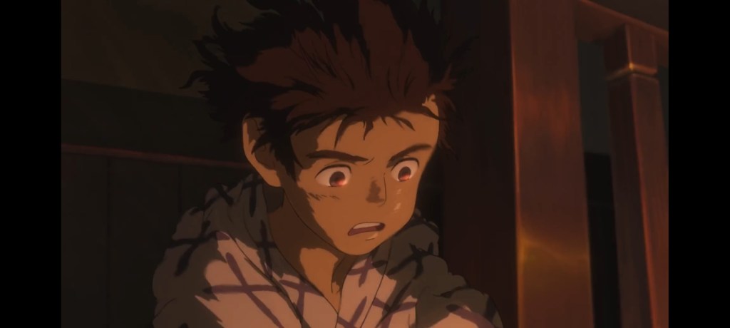 The freakiest performance is Pattinson as the heron. It really isn’t a talking bird, it’s more like a tiny, mean guy stuck inside a heron skinsuit. It works with the offsetting feeling of unreality that permeates the film. Pattinson’s voice is unrecognizable with a crazy growl or high-pitched squeaking. The heron has a truly weird looking image, as its beak opens and there’s a bulbous bit of flesh peeking out from underneath. That is the person inside as their face is slipping through the mask. Eventually, the man sheds the bird outfit and engages with Mahito. The heron invites the boy into the magical world with a promise of being reunited with his long-lost mother, but when Mahito discovers his mother, the result is the heron’s magical trickery in a striking image of the mother melting away. The film is full of trippy bits like this, such as one scene with frogs crawling over Mahito’s face, cajoling him to come join him in the other world.
