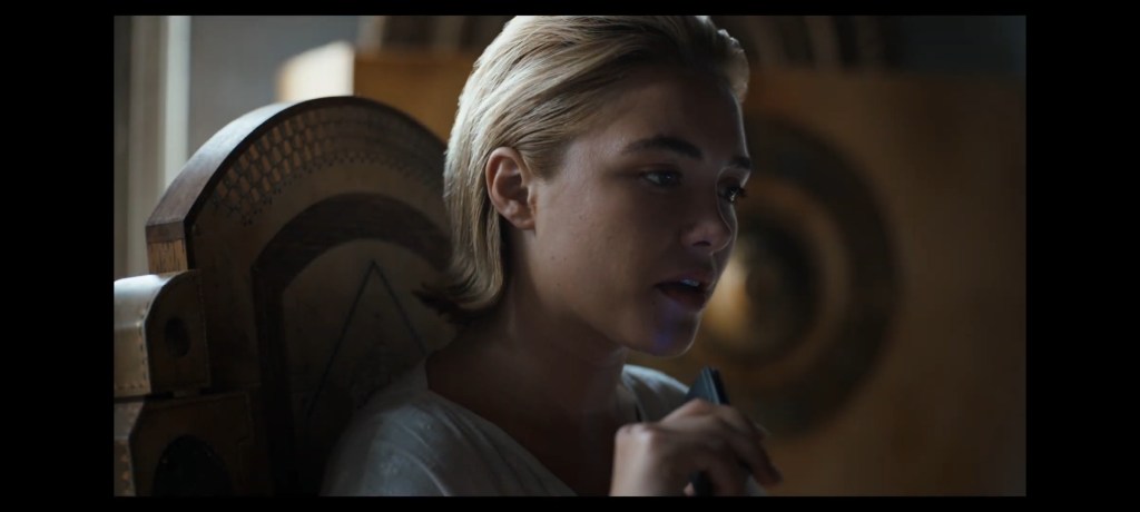 The movie kicks off with a succinct yet poetically told recap of the last film by the Princess Irulan (Florence Pugh), the daughter of the Emperor. There is a subplot involving Irulan working with the master manipulators, the Bene Gesserit led by Mohiam (Charlotte Ramping). This adds palace intrigue as Pugh’s Irulan looks concerned about what is happening on Arrakis as Mohiam tells her things that are going to happen. Both Ramping and Pugh sell the importance of this moment, all while dressed in spectacular looking future outfits. Walken’s Emperor seems like a feeble old man, but he can bring moments of nastiness, especially in the third act when he confronts the Harkonnens for their screw ups and when he gets a tense face to face with Paul.