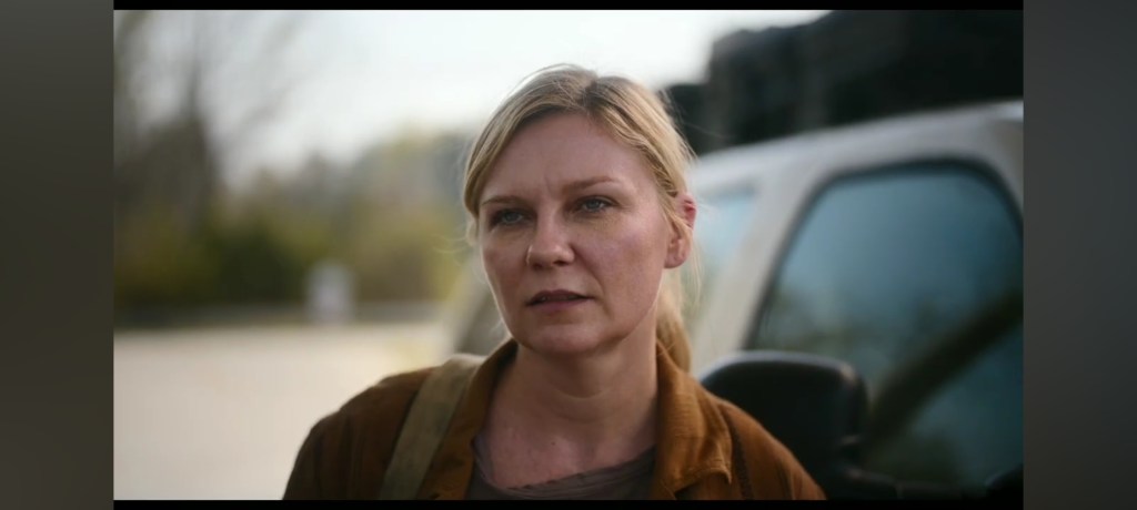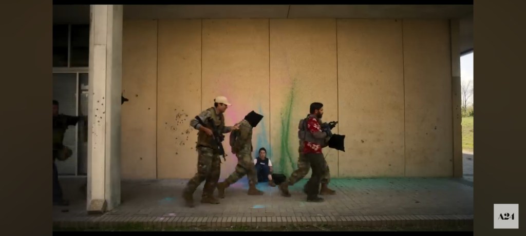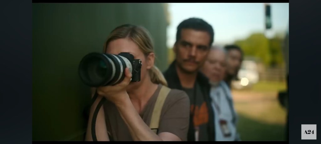 Lee (Kirsten Dunst) is a photojournalist documenting a modern day American Civil War, as states fight against each other, and the last holdout is the President of the United States (Nick Offerman) who is sealed up in Washington DC. She and her fellow reporter, Joel (Wagner Moura) want to interview and photograph the President, something that their old journalist veteran friend, Sammy (Stephen McKinley Henderson) says is suicide as the President’s forces view journalists as enemy combatants. Also tagging along is an aspiring photojournalist, Jessie (Cailee Spaeny). On their road trip across a war-torn America, Jessie tries to learn to be a photojournalist even if sometimes she is too terrified to take pictures. But along the way, they run into way too many people killing other people, and they may end up getting pasted before they even make it to DC.