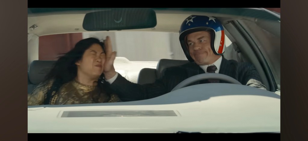 Cena’s Noel is the big dopey yet lovable guy that he has played in various other roles before, but he is pretty good at it. He’s introduced rather intensely rapping the “Turtle Power” rap which is funny for how bizarre it is, and in a climatic action scene he is strapped to a chair and bashing folks while singing the TMNT rap. Also, at the end he opens a Ninja Turtle pizzeria and then is immediately shut down for copyright infringement. Awkwafina’s job is basically to look befuddled, yell loudly and make a few quips. There are a few moments in between where they share some tragic backstory which makes them a bit more fleshed out characters than just running and hollering. A moment near the end when Kaite threatens to off herself so the bad guy doesn’t get any money which is a bit too dark. Although Katie is constantly convinced that Noel is going to turn on her, it never happens, which goes a long way to make Noel likable. He is even willing to help her quit the lottery and get no money just out of altruism.