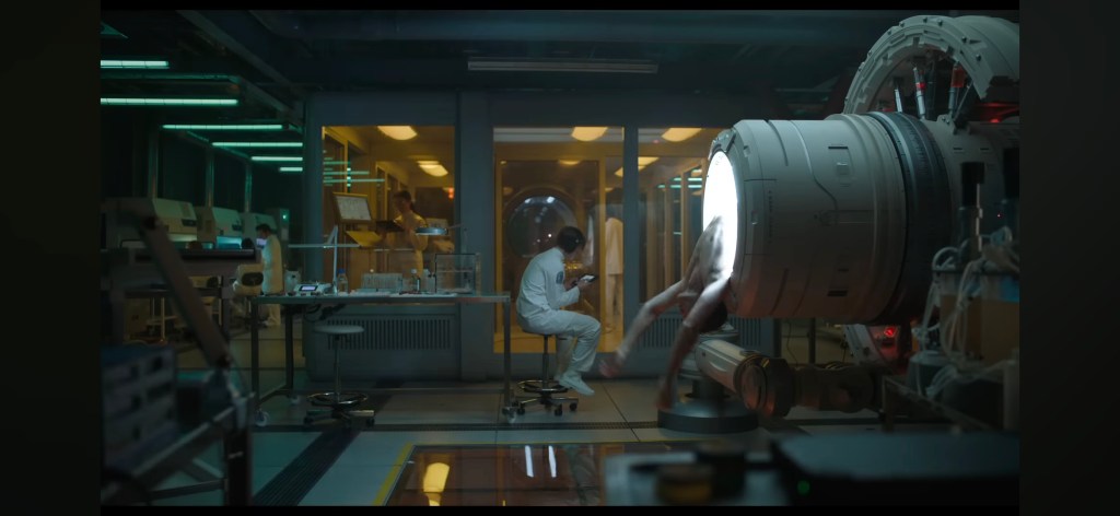 The set-up for why being a Multiple is bad is an entertaining flashback to Earth where people had scientific and religious questions about how to deal with the situation. Then it is revealed that one of the founding doctors of the cloning technique was a mass murderer who uses his own Multiple to get away with various crimes. After that, Multiples had to be eliminated. The premise of disposable worker people is engrained in the film’s narrative, as Mikey’s various blasé reactions to dying, and the way people incessantly ask him about what it’s like to die, show how dehumanizing it is at the bottom rung. When a different worker is killed, Marshall just rails on Mikey saying that as an Expendable, it is his job to die.