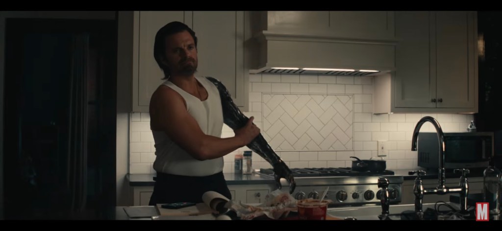 There’s lots of cool action here. The movie opens with a spectacular stunt of dropping Yelena off one of the world’s tallest buildings, and the brawl inside of the storage facility has unexpected twists before it all melts down. Then the group escapes by absurdly crawling up a shaft. Another great action bit is when Bucky takes out a bunch of chumps with his crazy Winter Soldier techniques. The movie balances character work and spectacle. Pugh’s Yelena is burned out but still won’t give up when it looks like things are hopeless and she does something really brave at the end to confront the Void. As her father, Alexei is pining for the glory days and his jovial attitude is infectious, and he has a soft spot for his daughter. John-Kamen as Ghost gets in some cool new ways to use her phasing powers (especially a jaw-dropper she has with Taskmaster), and Russell as Walker has some of the best bits as a guy who got fired from being Captain America. His bitterness still seeps through, at times looking like he’ll abandon his compatriots to save himself. Stan as Bucky shows his world weariness at over 100 years old, and Bucky views these losers as beneath him, but his inherent good nature shines through as he saves his newfound friends. Someone with no inherent good nature is Valentia, and Louis-Dreyfus conveys that Valentia is completely amoral but still rather chipper about it, making her oddly likable even as she does terrible things.