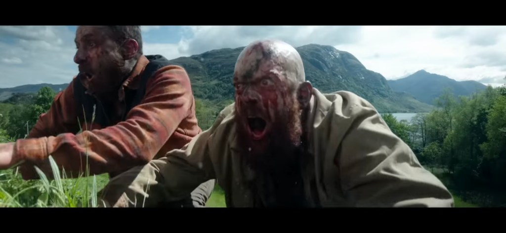 The Infected scenes are top notch. The movie opens with a flashback to the Rage virus breakout featuring a young, terrified kid escaping the Infected rampaging his house (the visual of blood splatter all over a TV of Teletubbies is twisted). When he finds his priest/father, the dad is overjoyed that the Day of Judgement has arrived. Disturbingly, the father lets himself be consumed and turned by the Infected as he goes from joy to rage. The scene when Jamie and Spike are running to their island from a giant Alpha Infected is great as the guards pump the giant monster with flaming arrows, desperate to stop it. Lewis-Parry as Samson, a giant Alpha nicknamed by the doctor, is great at looking incredibly insanely angry, and there are some moments involving a pregnant Infected that are really twisted but Lewis-Parry also shows the anguish behind the monster’s eyes. The final scene of the movie twists again for a cool promise of what is to come in the next movie, The Bone Temple, which looks like it will also shift tones once again.