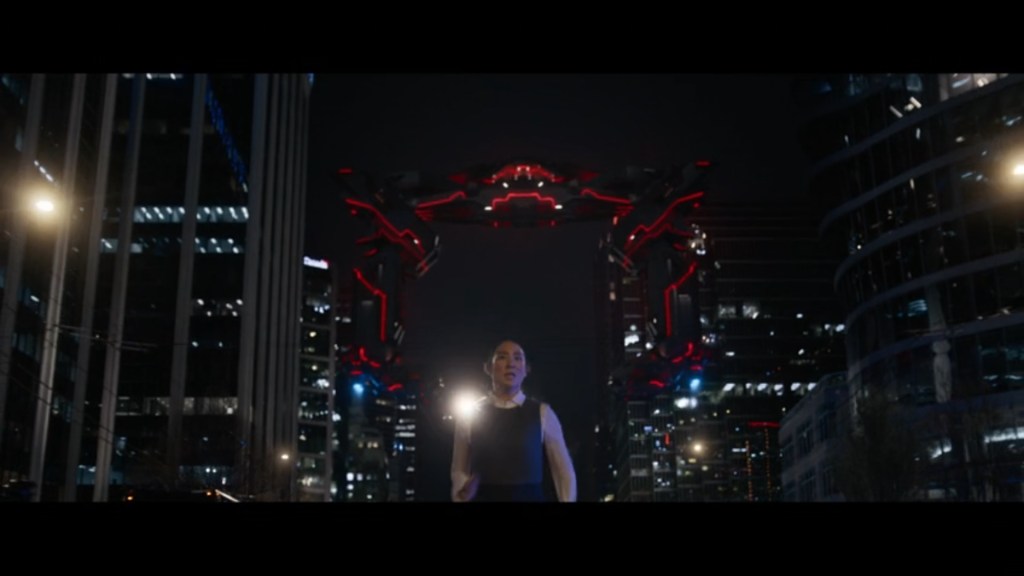 Athena, Ares’ warrior companion turned nemesis, has a Terminator-like determination to fulfill her objective by erasing Eve and Ares. Lee’s Eve gets a mandatory sad backstory about a deceased sister and how Eve wants to save the world with the Permanence program. She gets a really cool lightcycle chase, though. Lightcycles have been cool for decades. The look of the Grid world is striking against the human settings. When one of the big ships shows up and starts shooting out flying machines it looks appropriately apocalyptic. This is propelled by the excellent, discordant techo metal score by Nine Inch Nails. It really accentuates the sci-fi weirdness, like whenever someone is derezzed, the NIN score sounds horrific. And there’s moments when the score can be sweeping and emotional, like when Ares says goodbye to Flynn with a great visual callback to the original Tron.