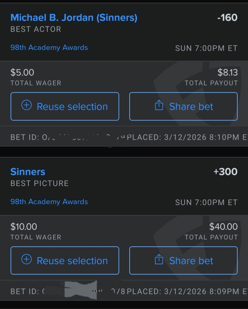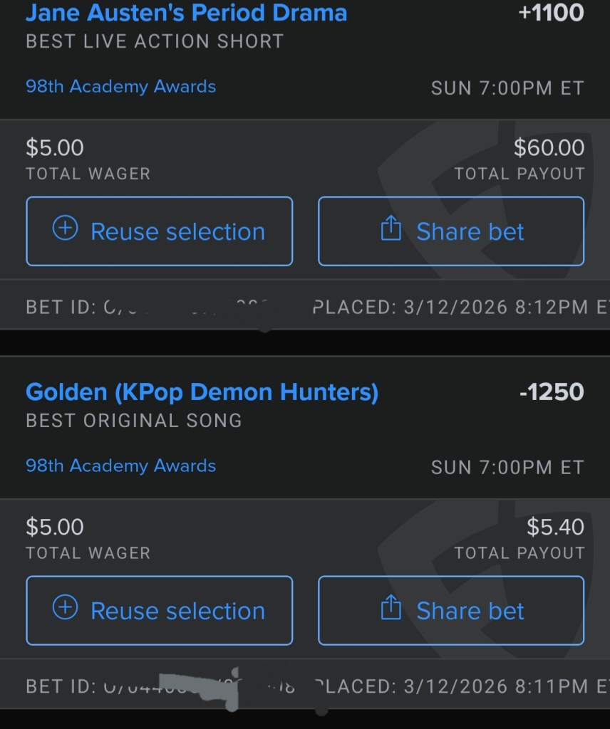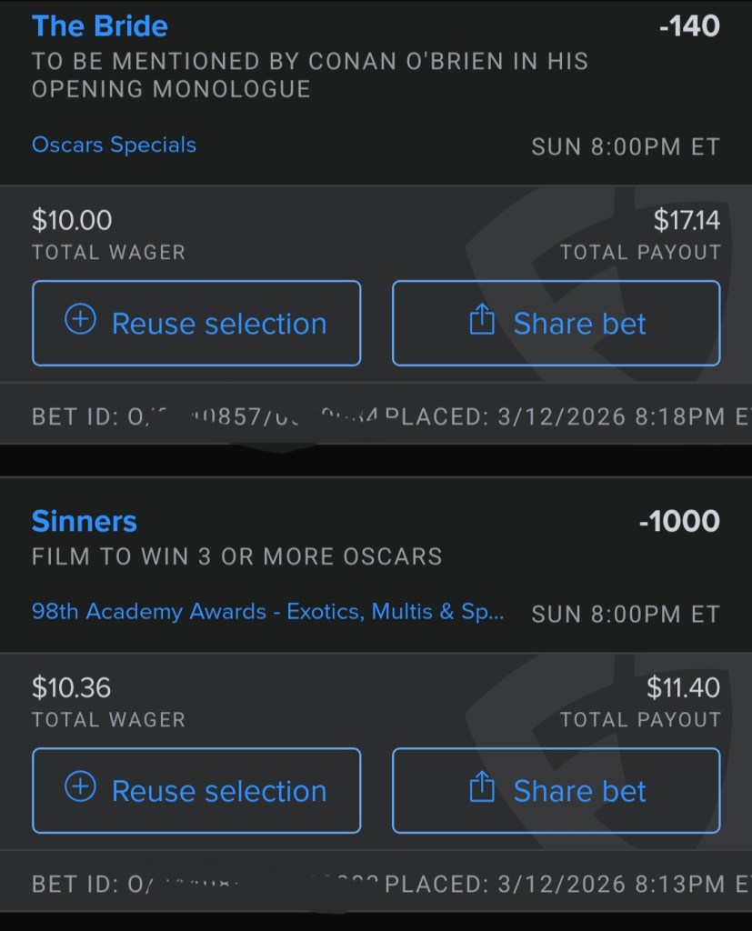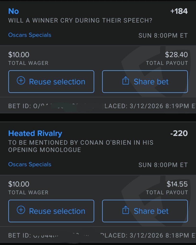 Going heavy on Sinners, as it was my #1 movie of the year, and Michael B Jordan’s dual performance has shot his odds up lately. The bets on Kpop are too easy and don’t pay off well a lot but some others do. Payout for the excellent score for Hamnet is huge. Also I’m pretty sure Conan is going to make a Heated Rivalry reference and The Bride! bombing. And betting on no crying at this Awards!
