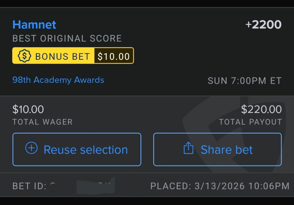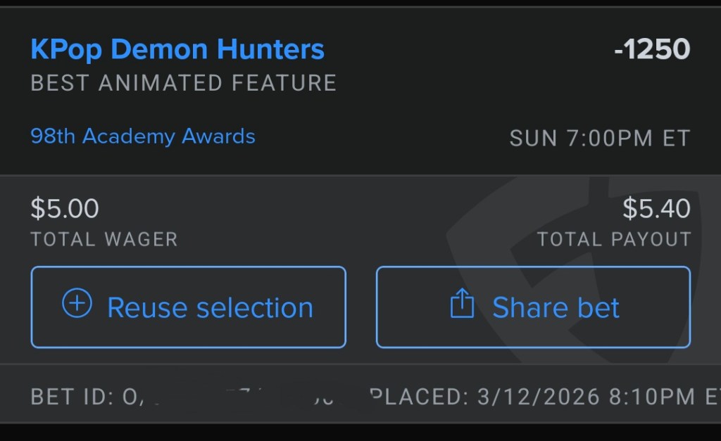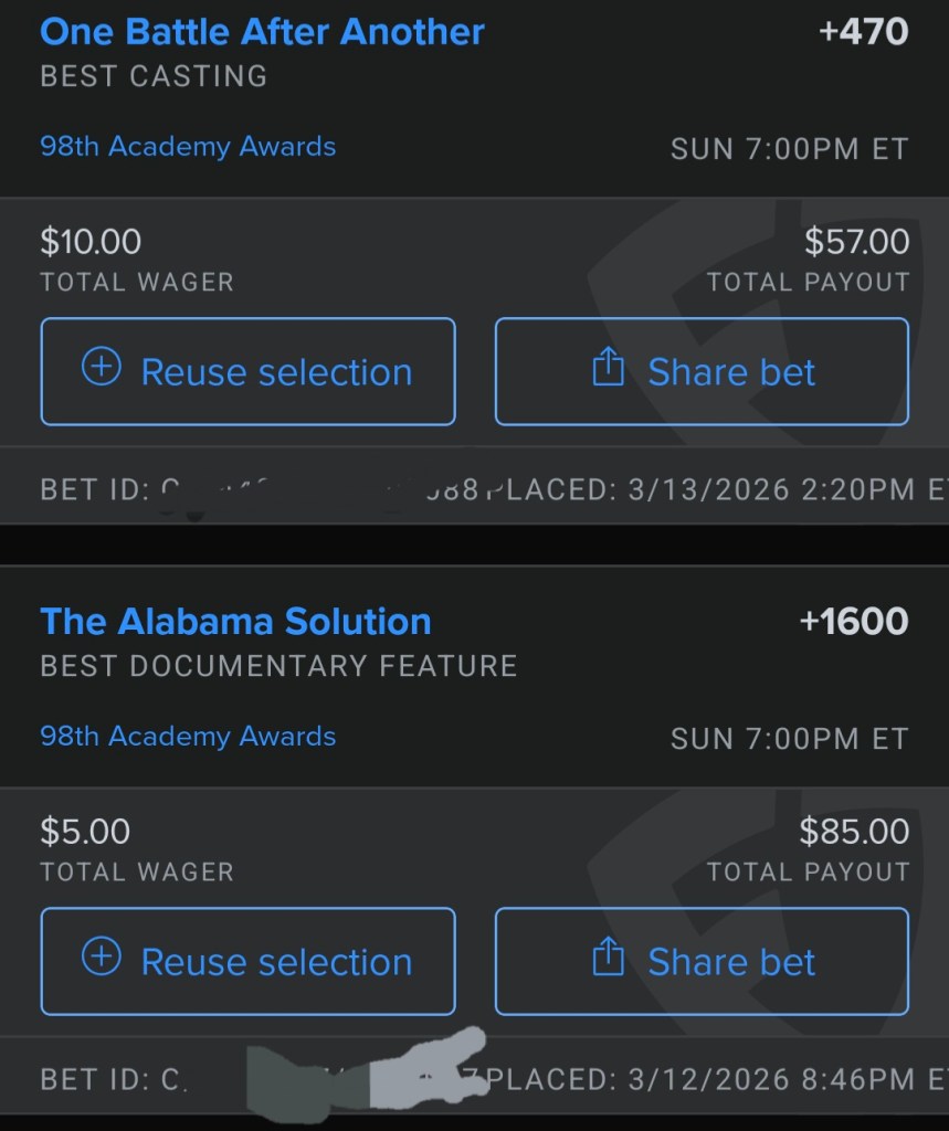 So with the 98th Oscars upon us, a significant chunk of the nominated films I have either already written reviews for, Sinners, One Battle After Another, Hamnet, or they made it into my Best of 2025 list, Frankenstein, Marty Supreme, and Bugoina. So let’s examine the leftover nominees and some other categories and my Oscar bets (note: the payouts for Kpop Demon Hunters for Best Animated and Golden for Best Song are really bad but Alabama Solution for Best Documentary has a huge payout).